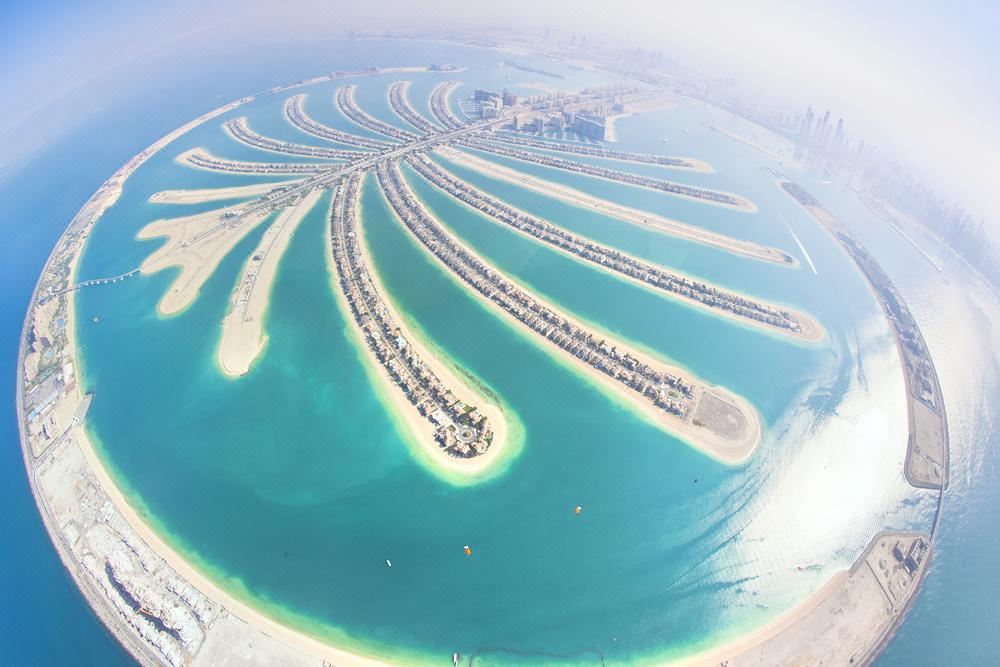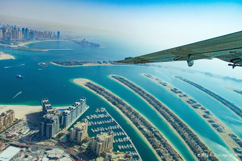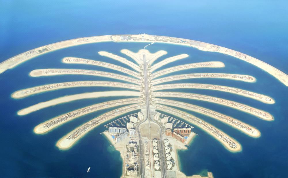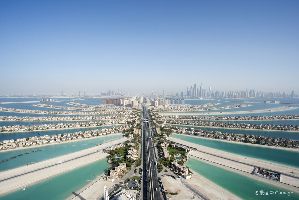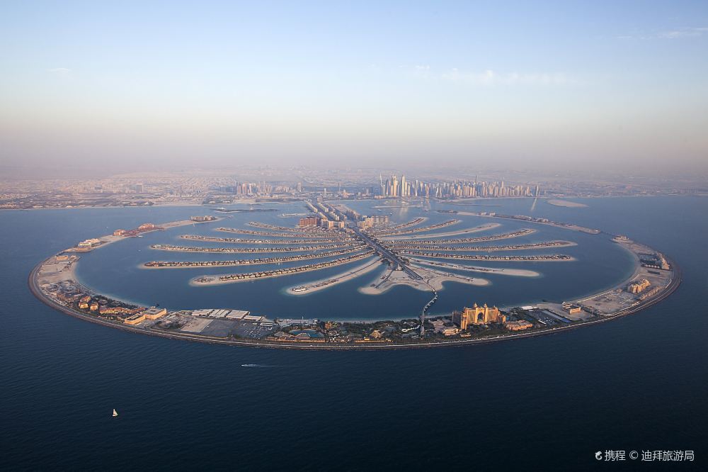 从空中俯瞰,朱美拉棕榈岛(PalmJumeirah)形似棕榈树干。它是世界上大的陆地改造项目之一,号称“世界第八大奇迹”。