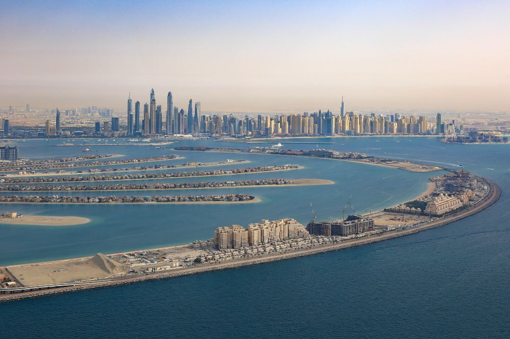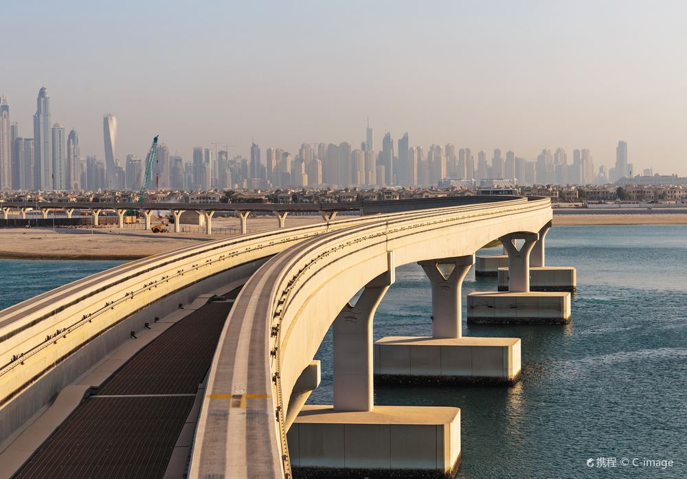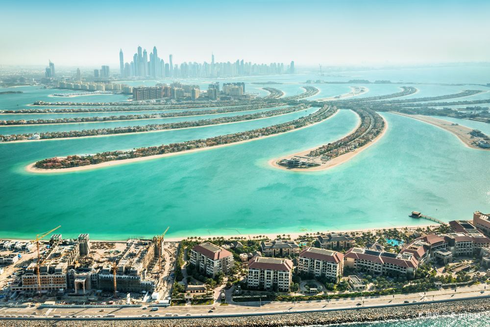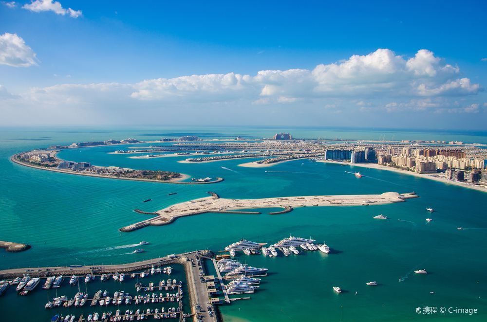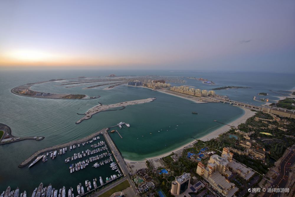 从空中俯瞰,朱美拉棕榈岛(PalmJumeirah)形似棕榈树干。它是世界上大的陆地改造项目之一,号称“世界第八大奇迹”。