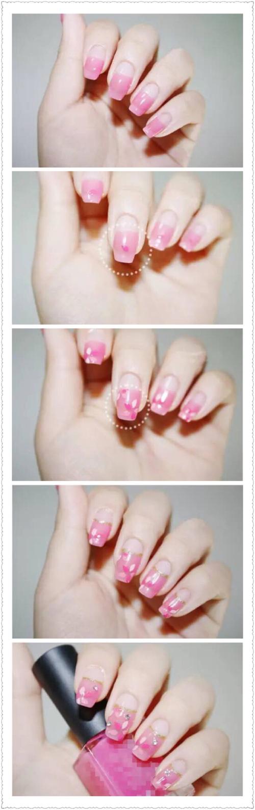 梦幻少女系美甲 step 1:将所有指甲都涂上玫红色半透明法式.