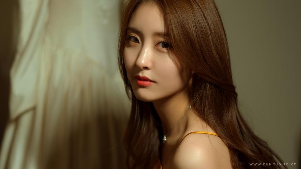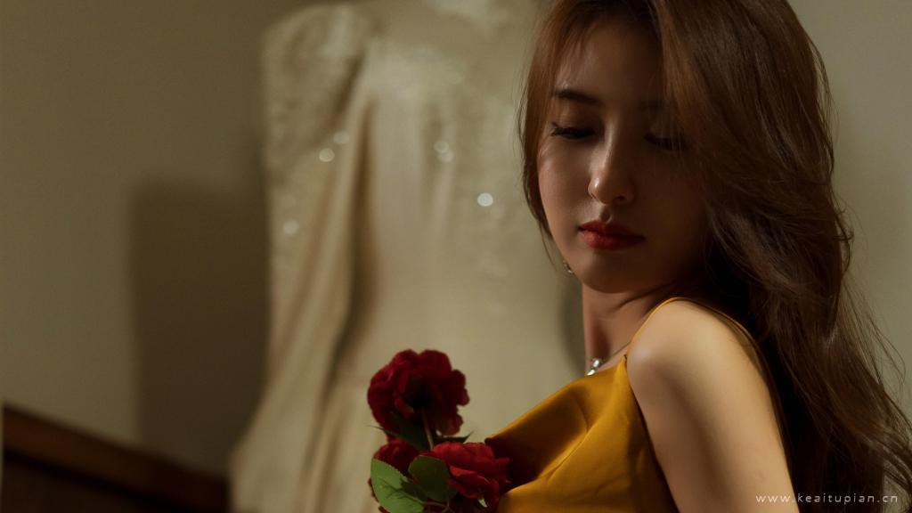 手拿鲜花的长发美女香槟色吊带长裙高贵优雅写真桌面图片