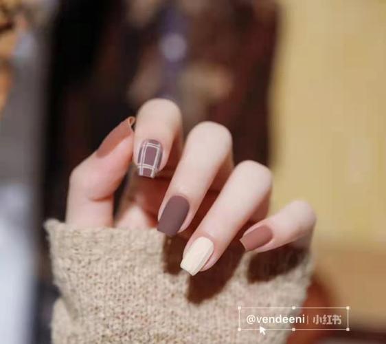 秋冬豆沙色流心格纹气质磨砂美甲67图