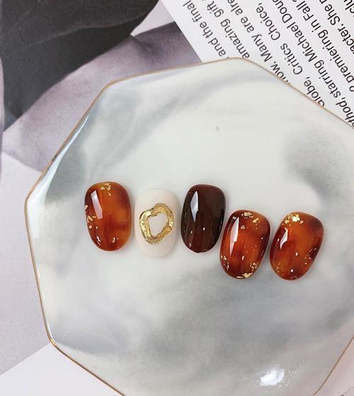 圆形棕色裸色晕染贝壳片金箔琥珀想学习这么好看的美甲吗?