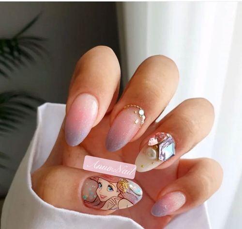 手绘定制美甲甲片光疗迪士尼卡通童话公主美人鱼爱丽儿图案亮片