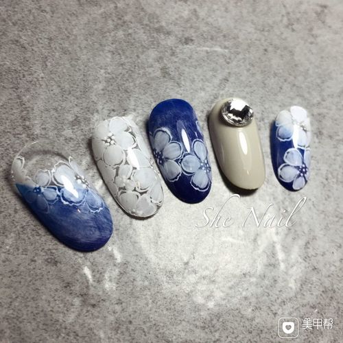 圆形简约手绘蓝色白色牛仔蕾丝美甲图片