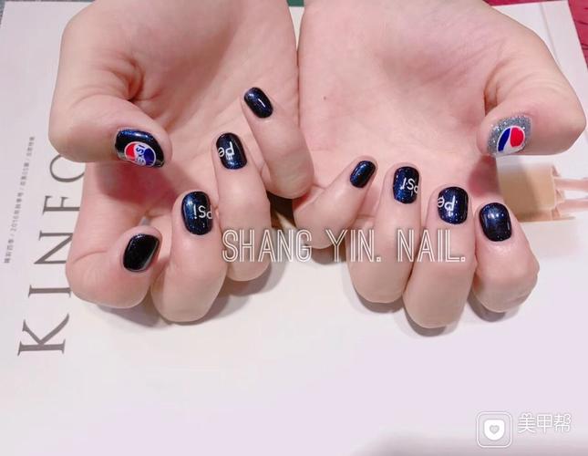 方圆形手绘蓝色百事可乐 美甲图片