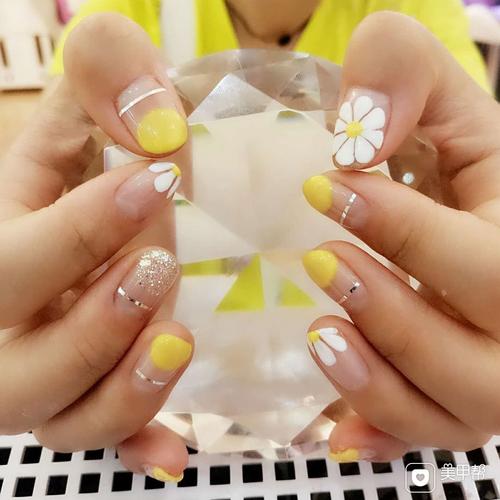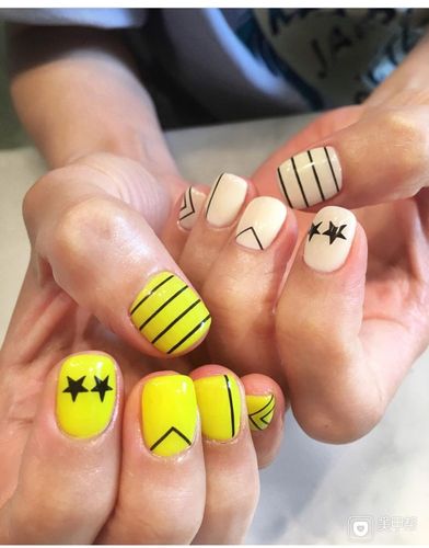简约手绘黄色白色线条美甲图片