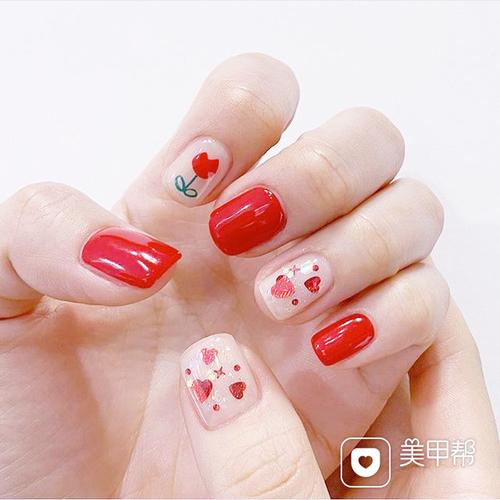 方圆形红色白色手绘花朵亮片美甲图片