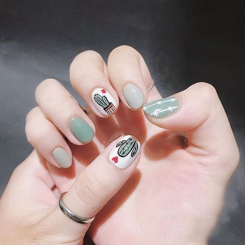 圆形绿色白色手绘仙人掌美甲图片