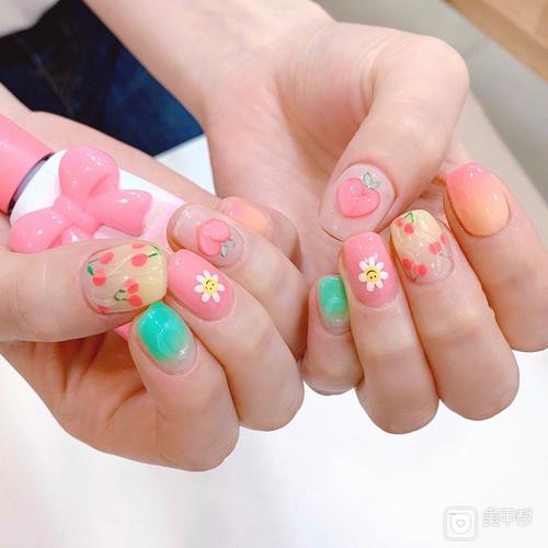 粉色绿色樱桃手绘花朵美甲图片