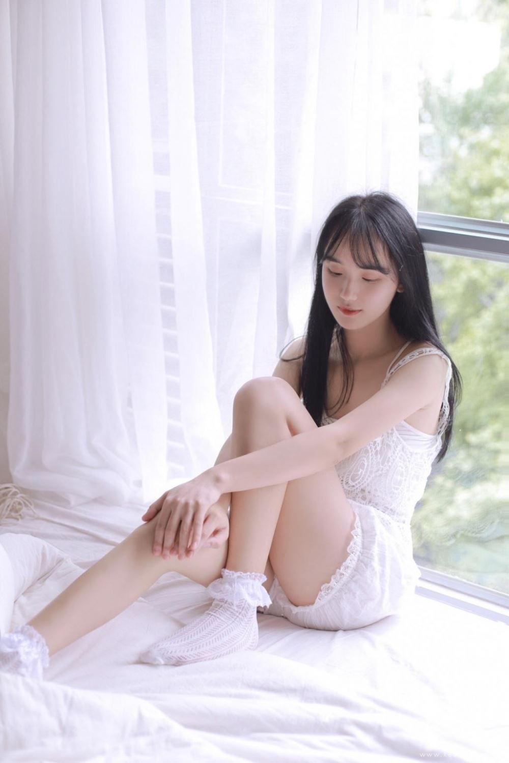 纤细嫩白少女蕾丝吊带短裤清凉室内清纯写真图片