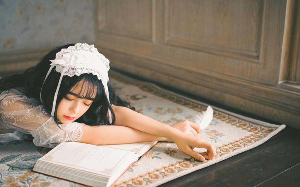 看着书闭眼睡着的可爱美女图片