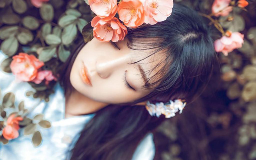 花丛中闭眼沉思的美女唯美图片