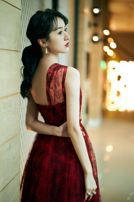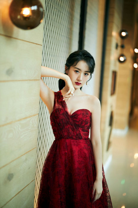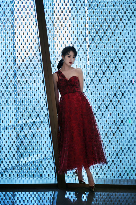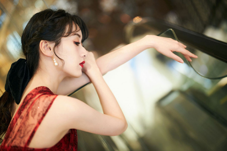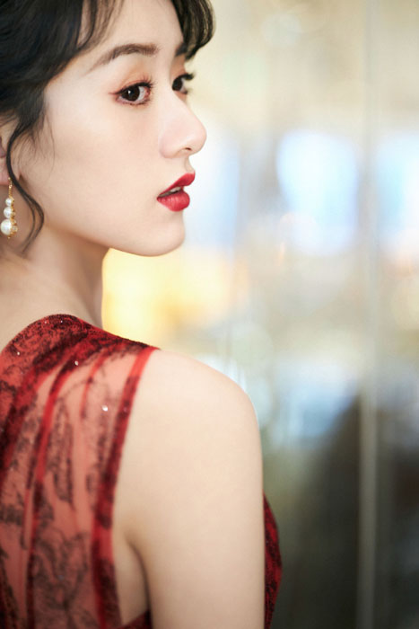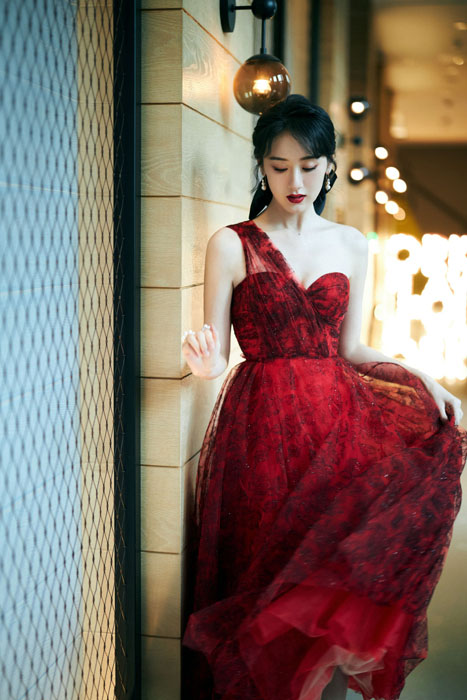 袁冰妍红色蕾丝单肩裙性感造型写真图片