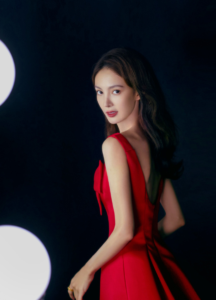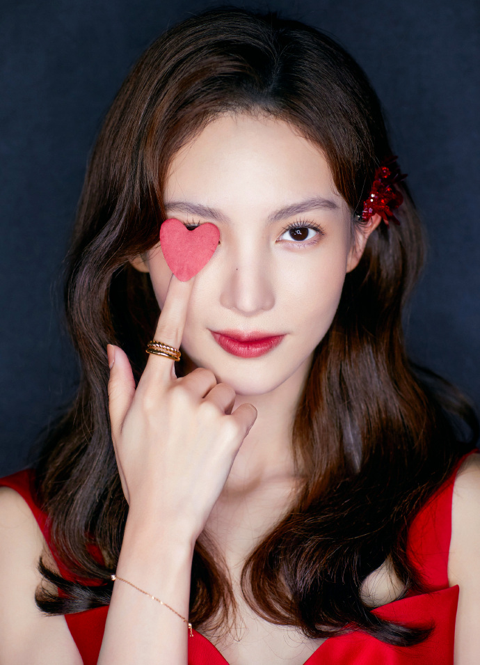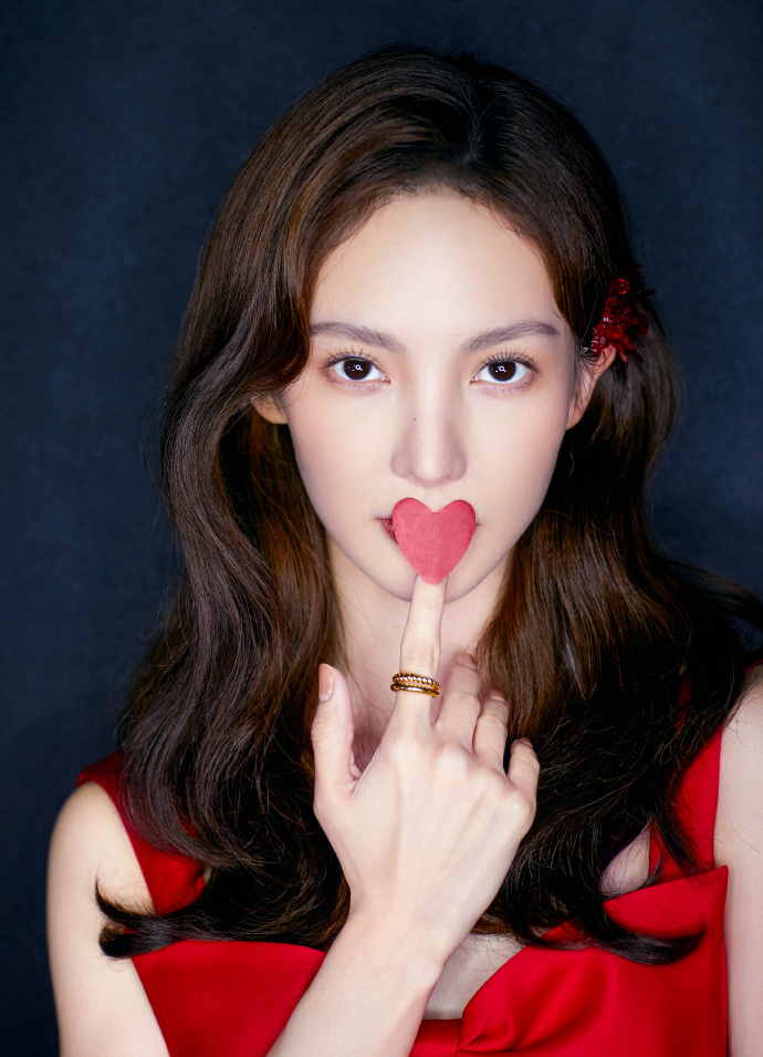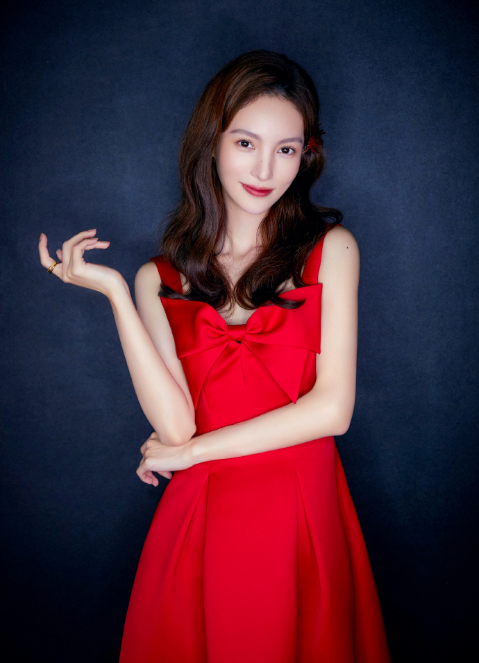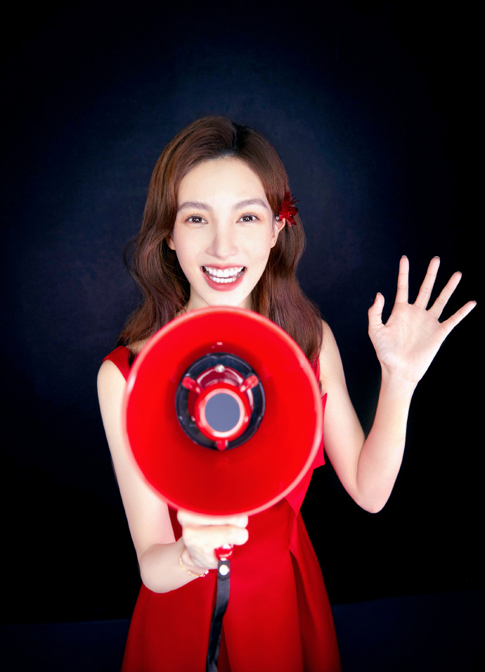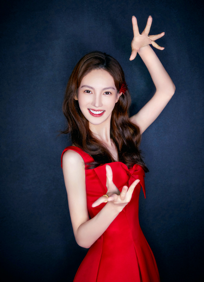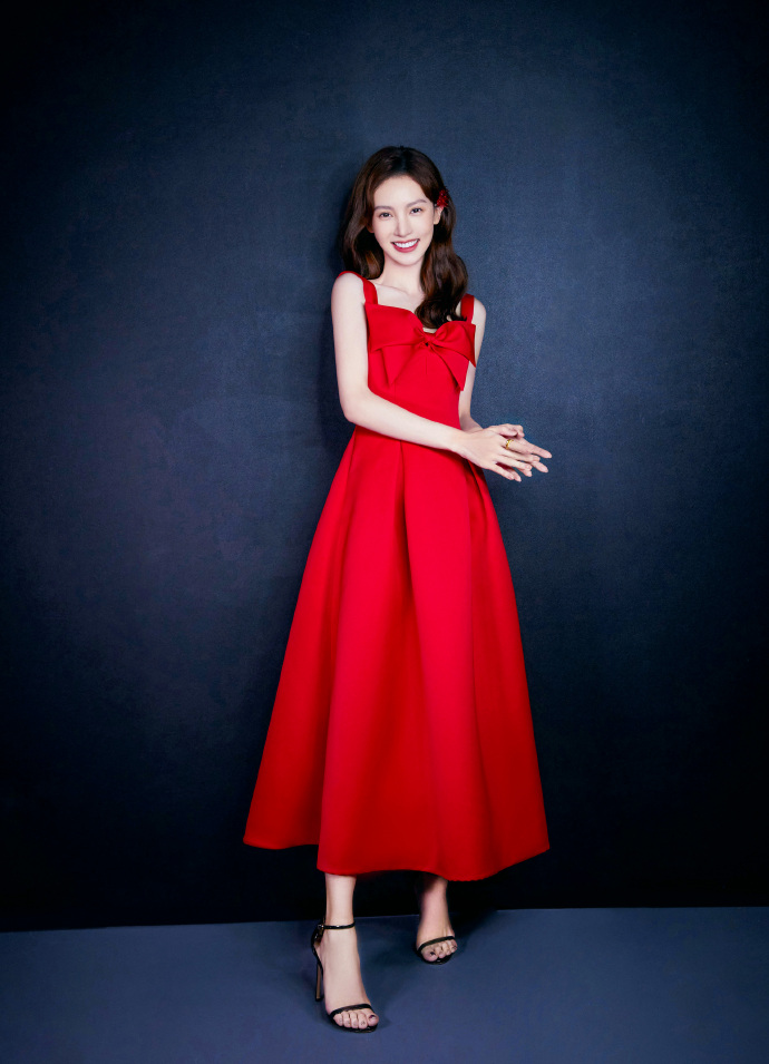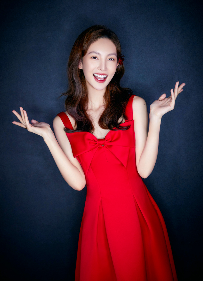 金晨红裙子一字带高跟鞋搞怪可爱图片