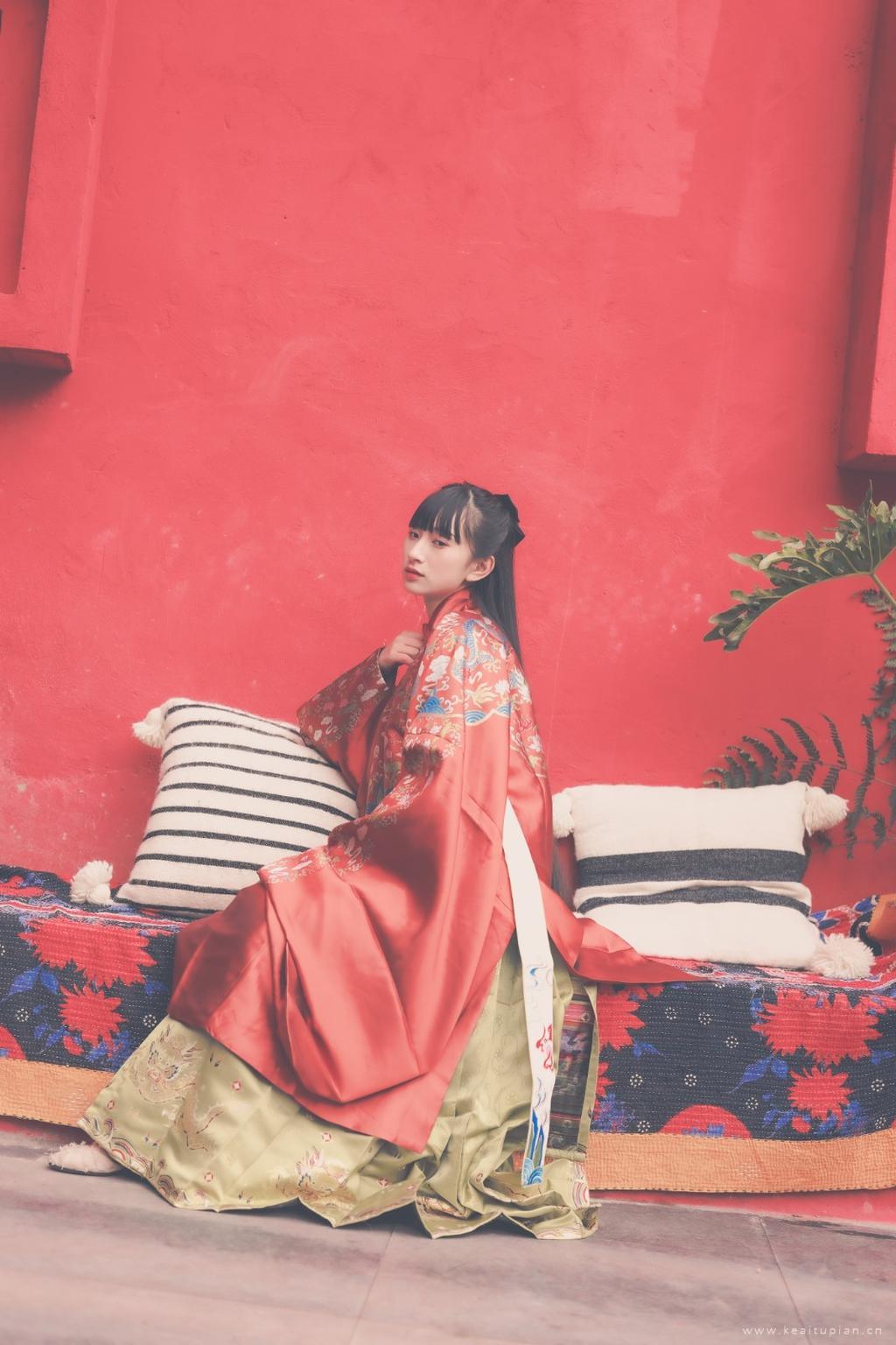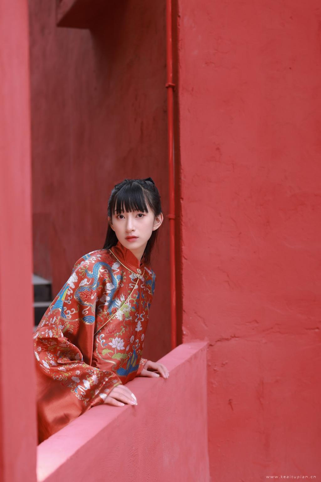 穿着龙刺绣红衣的黑长直发古装美女典雅古风写真图片