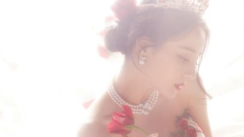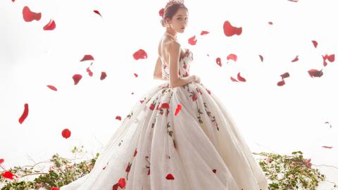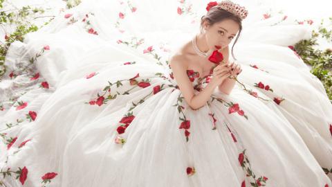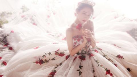 迪丽热巴玫瑰刺绣拖尾白纱裙高贵公主范写真图片