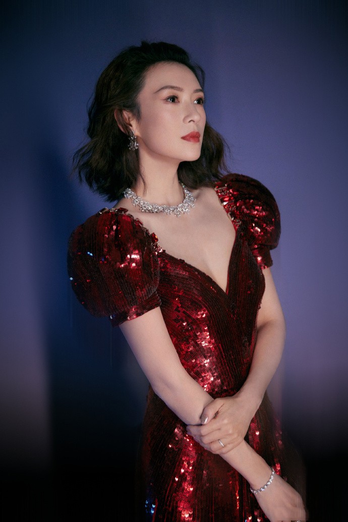 章子怡红色v领礼服裙大气优雅写真图片