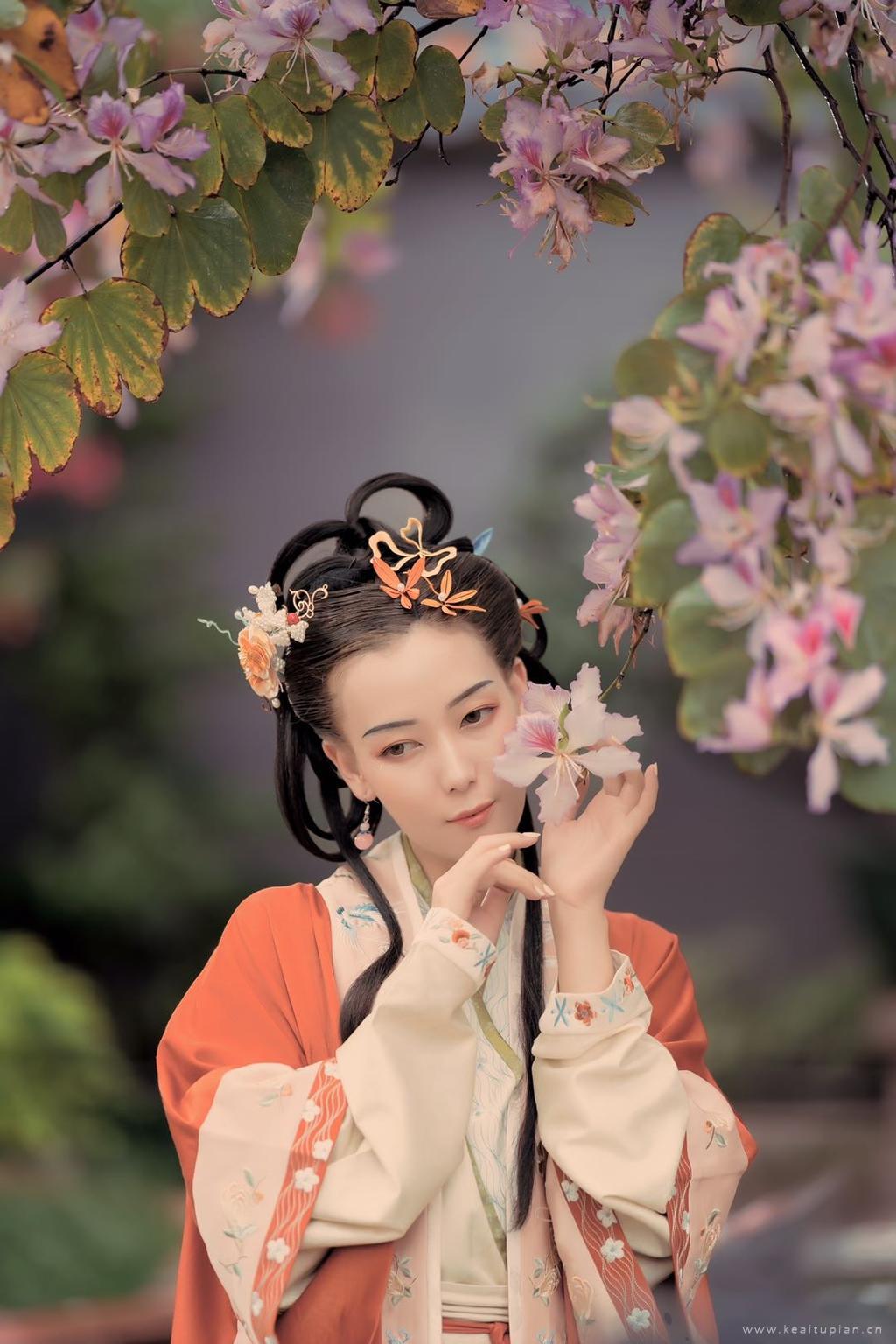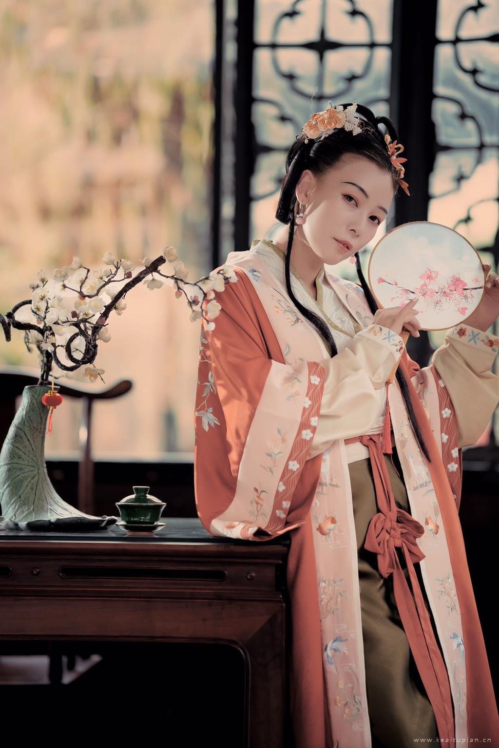 戴花执扇小憩的古装美女日常古风写真图片