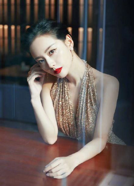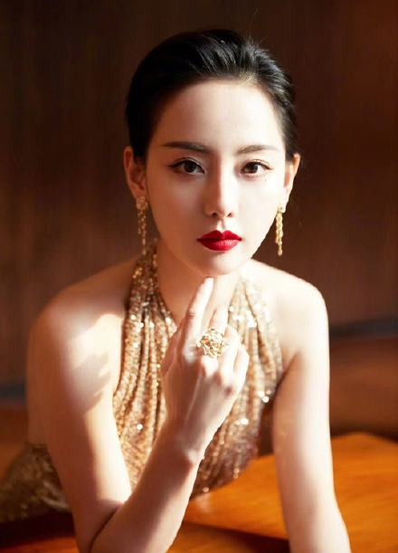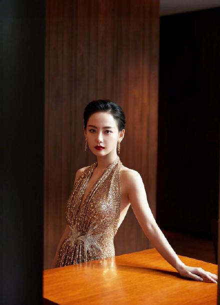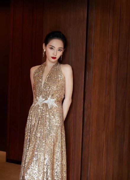 张嘉倪香槟色露背细闪长裙秀美背时尚图片