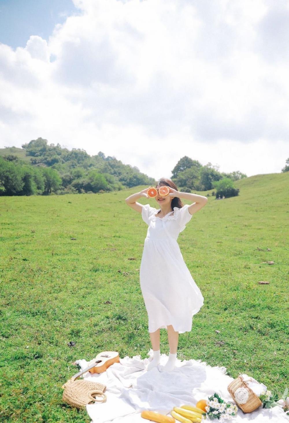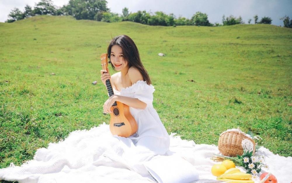 一字肩白裙美女户外小清新唯美气质写真图片