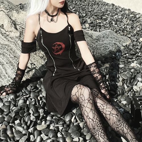 miub2022新款拉链小黑裙春夏季性感修身包臀裙暗黑朋克吊带短裙女
