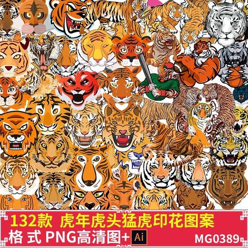 2024虎年老虎猛虎头像卡通印花t恤烫画图案png免抠图片ai矢量素材
