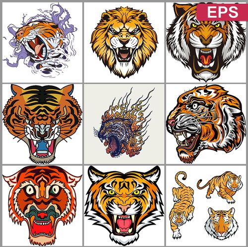 凶猛勇猛动物老虎狮子头像民俗风民族风eps矢量印花图案设计素材