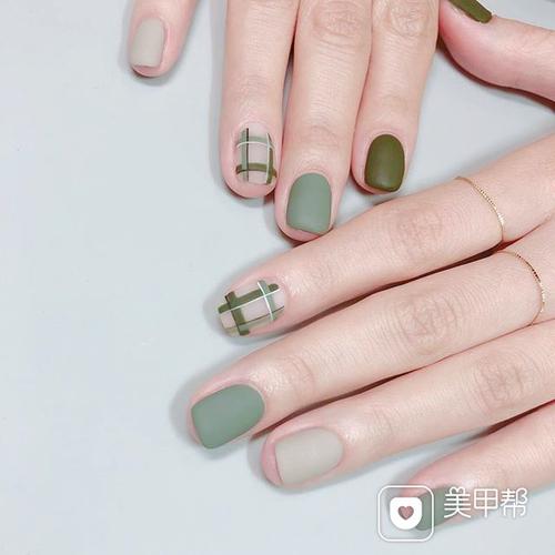 方圆形绿色裸色格纹磨砂美甲图片